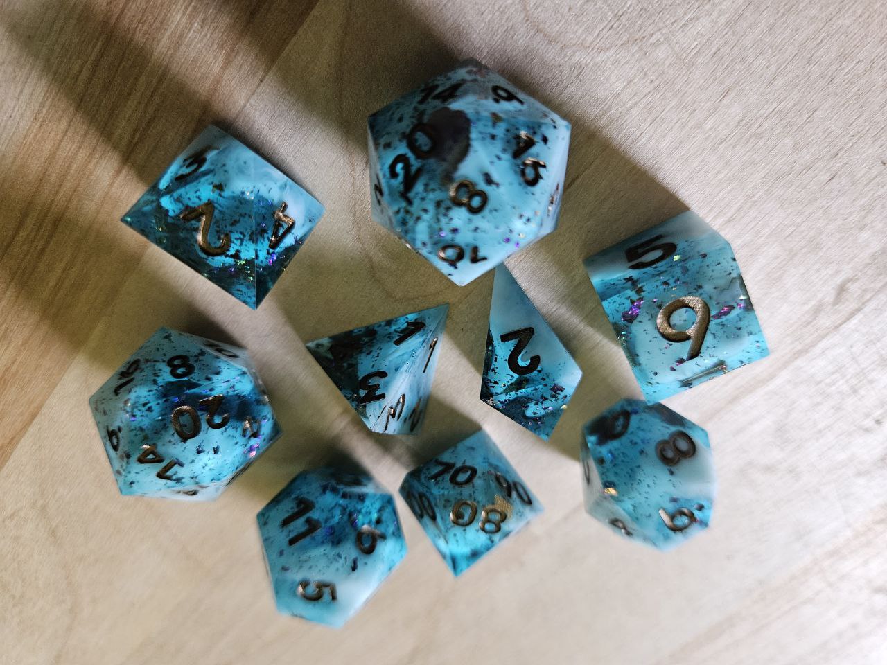 A 9 piece Hard-Edged, Totally Hand-Made and Unique Dice Set Comes with all dice pictured, cast, sanded, polished, and painted entirely by hand by Rukis and Alastair Set comes in a cork-stoppered glass bottle