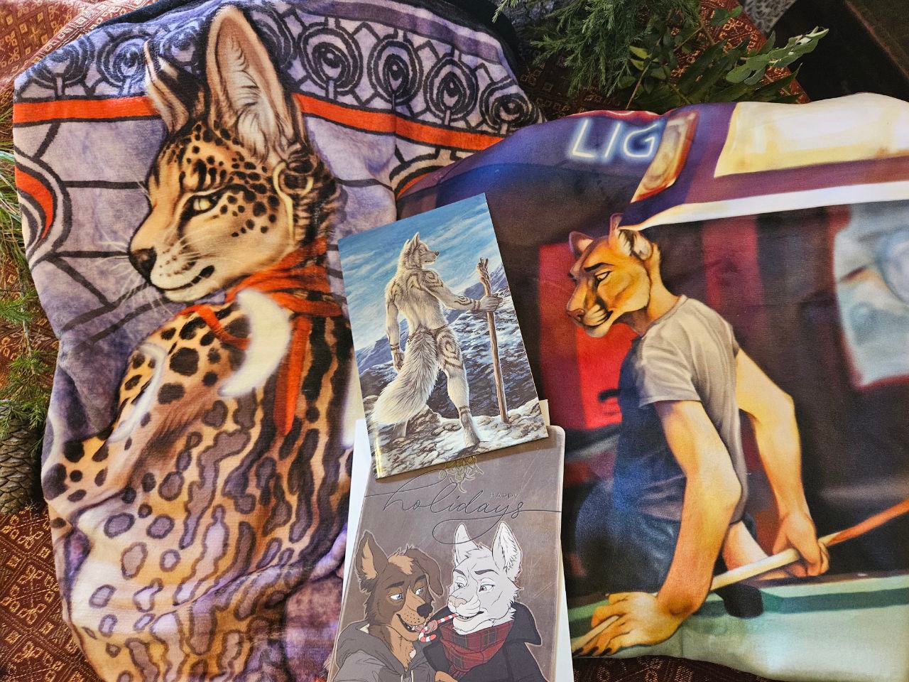 A cozy collection to warm your next evening on the couch! Two lap blankets featuring artwork by Rukis, and Alastair As well as two Thank you Holiday Cards signed and doodled on by the creators <3